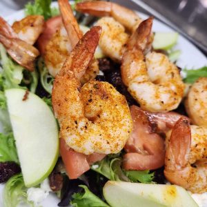 | Coconut-battered gulf shrimp, broccoli-cranberry slaw, pineapple, and Caribbean rum glaze | |