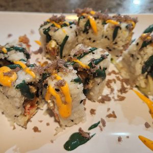 | Tempura shrimp, crab, cucumber, scallions, and jalapeno topped with spicy sauce | |