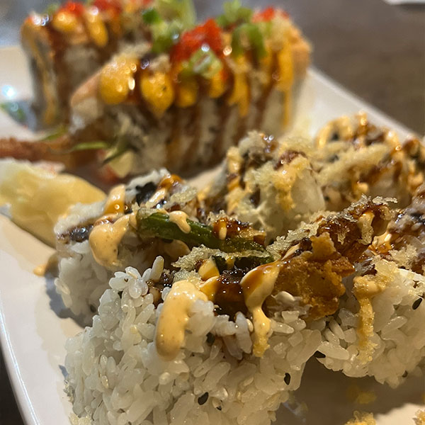 | Tempura shrimp, avocado, crab, sweet eel sauce, and scallions | |